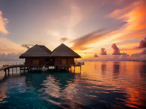 Adembenemende zonsondergang bij twee exclusieve watervilla's in de Malediven. De traditionele rieten daken weerspiegelen in het kristalheldere turquoise water, terwijl de oranje avondlucht het perfecte decor vormt. Een ultiem luxe vakantieverblijf voor wie op zoek is naar privacy en romantiek in een tropische setting.