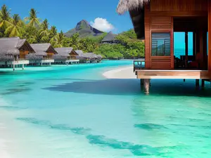 Idyllische watervilla's gebouwd op palen boven een kristalheldere turquoise lagune. Deze luxe accommodaties met rieten daken zijn omringd door wuivende palmbomen en hebben direct toegang tot het parelwitte strand. Op de achtergrond rijst een majestueuze berg op, wat zorgt voor een adembenemend tropisch panorama.