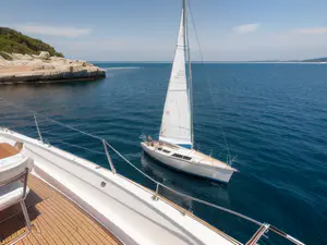 Sfeervolle nautische opname van een elegant zeiljacht met witte zeilen tegen een achtergrond van azuurblauw water en rotsachtige kustlijn. Het teakhouten dek op de voorgrond en de strakke reling benadrukken de luxe uitstraling van deze maritieme setting, perfect voor watersport- en lifestyle content.