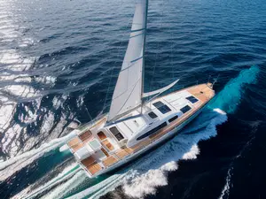 Spectaculaire luchtfoto van een modern zeiljacht dat door de azuurblauwe golven snijdt. Het luxueuze vaartuig combineert klassiek teakdek met moderne technologie en comfort. perfect voor exclusieve zeiltochten, met ruim zonnedek en state-of-the-art navigatieapparatuur. De witte zeilen tegen de blauwe zee creëren een tijdloos beeld van vrijheid.