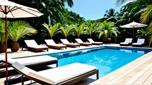 Luxe zwembad met ligbedden en palmen in tropische wellnessomgeving AI-gegenereerd