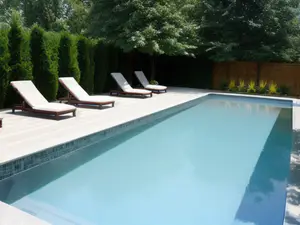 Stijlvol rechthoekig zwembad met elegante witte ligbedden in een modern aangelegde tuin. De combinatie van strakke coniferen, lichte bestrating en warme houtaccenten creëert een luxueuze wellness-sfeer. perfect voor ontspanning en een vakantiegevoel in eigen tuin.