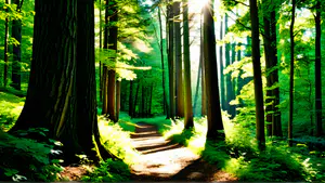 Betoverend natuurbeeld van een sfeervol bospad omringd door majestueuze bomen waar gouden zonnestralen doorheen schijnen. Het frisse groene gebladerte en de mysterieuze sfeer maken dit tot een perfect voorbeeld van Nederlandse natuurfotografie. Ideaal voor thema's als natuurbeleving, ontspanning en duurzaamheid.