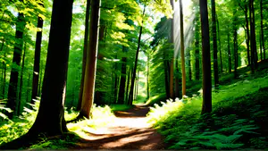 Sfeervol bospad omringd door majestueuze bomen waar vroege zonnestralen doorheen schijnen. Het zachte ochtendlicht creëert een magische sfeer in het weelderige groene bos. De combinatie van het kronkelende pad, varens en het natuurlijke lichtspel maakt deze natuurfoto perfect voor thema's als ontspanning, mindfulness en natuurbeleving.