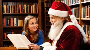 Magisch kerstmoment in bibliotheek met voorlezende kerstman AI-gegenereerd