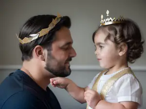 Ontroerend speelmoment vastgelegd met papieren kroontjes en gouden accenten. Een intiem portret waarbij een kleine prinses in wit jurkje met gouden details samen speelt. De warme sfeer en zachte belichting maken dit een tijdloos familieportret vol emotie en fantasie.