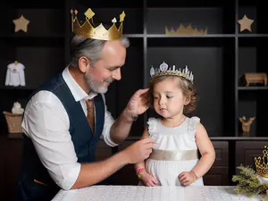 Betoverend tafereel in vintage setting met prachtige gouden en zilveren kronen. De sfeervolle compositie met donkere achtergrond en subtiele sterrendecoratie creëert een magisch sprookjesmoment. perfect voor kinderfeesten, fotoshoots en speciale gelegenheden waar fantasie centraal staat.