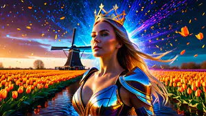 Betoverende Nederlandse compositie waar traditie en fantasie samenkomen. Een indrukwekkend tulpenveld strekt zich uit voor een authentieke windmolen tijdens zonsondergang, terwijl magische lichteffecten de lucht verlichten. De combinatie van gouden tulpen, blauwe accenten en mysterieuze elementen creëert een uniek Nederlands sprookjeslandschap.
