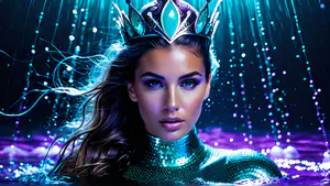 Betoverende fantasy compositie in levendige turquoise en paarse tinten. De mysterieuze sfeer wordt versterkt door glinsterende lichteffecten en een sierlijke kroon met edelstenen. perfect voor boekomslagen, fantasy-projecten of artistieke campagnes die een magische uitstraling vereisen.