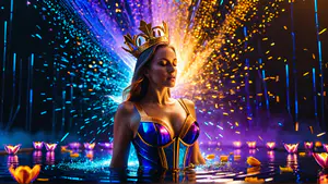 Betoverende fantasiefoto met een sprookjesachtige sfeer in een wateromgeving. De compositie toont gouden lotusbloemen op donker water, omringd door spectaculaire lichteffecten in blauw, paars en goud. Het dramatische contrast tussen de donkere achtergrond en de sprankelende lichtexplosies creëert een magisch theatraal effect.