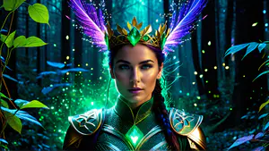 Betoverende fantasy-compositie in een mysterieus nachtelijk woud. De magische sfeer wordt versterkt door glinsterende effecten en een kleurenpalet van smaragdgroen en diep paars. Een gouden kroon met edelstenen en lichtgevende vleugels creëren een sprookjesachtige uitstraling. perfect voor fantasy-projecten en boekcovers.