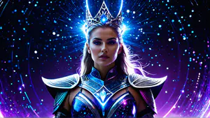 Betoverende fantasy afbeelding met futuristische elementen in neonblauwe en paarse tinten. Het ontwerp combineert een sierlijke kroon met een gedetailleerd harnas in cyberpunk-stijl. De achtergrond toont een mystieke sterrenhemel met lichteffecten die de magische sfeer versterken. perfect voor gaming, cosplay of fantasy projecten.