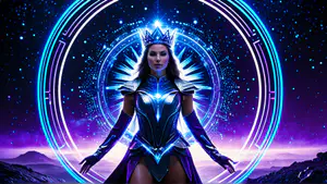 Betoverende fantasy compositie met een majestueuze verschijning in een futuristisch kostuum, gehuld in neonblauwe en paarse tinten. De dramatische belichting, glanzende kroon en mysterieuze sterrenhemel creëren een magische sfeer. perfect voor boekomslagen, gamedesign of moderne fantasy kunstprojecten.