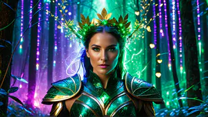 Betoverende fantasyfoto van een mysterieuze krijger in een turquoise glanzend harnas, gedecoreerd met gouden accenten. De magische sfeer wordt versterkt door een lichtgevende bladerenkroon en een achtergrond van paarse en groene lichteffecten in een sprookjesachtig bos. perfect voor fantasy-thema's en boekcovers.