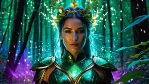 Betoverend fantasy kunstwerk van een mysterieuze verschijning in een magisch bos. Het smaragdgroene harnas met gouden accenten straalt in het turquoise licht, terwijl een gouden bladerkroon het geheel completeert. De achtergrond wordt gevormd door een betoverd woud met sprankelende lichteffecten in paars en groen.