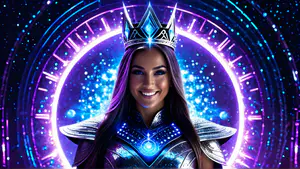 Betoverende fantasy compositie met sprankelende neonkleuren in paars en blauw. Een sierlijke zilveren kroon en futuristisch harnas stralen mystieke energie uit tegen een kosmische achtergrond vol sterren en lichteffecten. perfect voor boekomslagen, game-artwork of fantasy promoties.