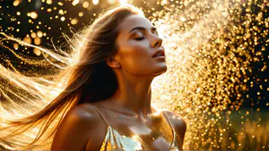 Betoverend portret bij zonsondergang met magische gouden lichteffecten en glinsterende bokeh. De warme tonen en natuurlijke lichtval creëren een dromerige sfeer, perfect voor mode- en beautyfotografie. De dynamische compositie met wapperend haar en glanzende huid zorgt voor een krachtig en artistiek eindresultaat.