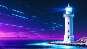 Betoverende nachtscène van een witte vuurtoren tegen een dramatische paarse sterrenhemel met lichtstrepen van vallende sterren. Het contrast tussen het heldere baken en de neonblauwe golven creëert een surrealistische sfeer. perfect voor moderne wanddecoratie of als achtergrond voor digitale projecten.
