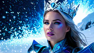 Betoverende fantasiefoto in winterse sferen met kristallen kroon en magische blauwe glitters. De dramatische belichting en ijsblauwe tinten creëren een sprookjesachtige uitstraling. perfect voor conceptuele fotografie, theatrale producties of winterse thema-evenementen. De gedetailleerde make-up en kristalaccenten versterken het mysterieuze kara...