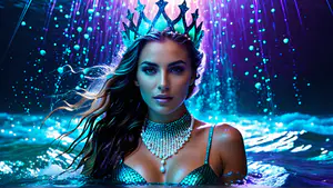 Betoverende fantasiefoto in turquoise en paarse tinten van een mysterieuze zeemeermin. De glinsterende kroon en parelketting reflecteren het magische onderwaterlicht, terwijl neonblauwe golven en lichteffecten een dromerige sfeer creëren. perfect voor fantasy-thema's, boekcovers of artistieke projecten.