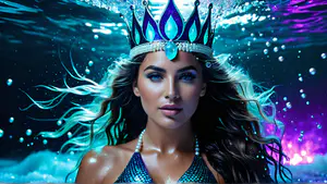 Betoverende onderwaterfantasie in levendige turquoise en paarse tinten. De mysterieuze sfeer wordt versterkt door glinsterende waterdruppels en een sierlijke kroon met edelstenen. perfect voor boekcovers, fantasiekunst of promotioneel materiaal in de entertainment industrie.