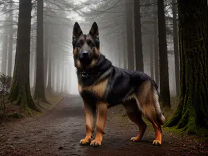 Krachtige Duitse herder staat alert op een bospad, omringd door hoge dennenbomen in een mysterieuze mistige atmosfeer. De natuurlijke belichting en nevelige achtergrond creëren een dramatisch effect dat de koninklijke uitstraling van deze trouwe viervoeter perfect vastlegt. Ideaal voor thema's rond loyaliteit, bescherming en natuurlijke kracht.