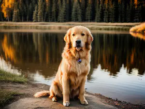 Prachtige Golden Retriever zit alert en trots aan de oever van een spiegelglad bosmeertje. De warme herfstkleuren van de dennenbomen worden weerspiegeld in het water, terwijl het gouden avondlicht de vacht van de hond perfect belicht. Een rustgevend natuurtafereel dat perfect de band tussen hond en natuur vastlegt.
