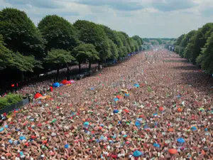 Indrukwekkende luchtfoto van een gigantisch openluchtfestival waar duizenden bezoekers samenkomen tussen twee groene bomenlanen. De kleurrijke parasols en festivaltenten steken af tegen de mensenzee, terwijl het natuurlijke decor van volgroeide bomen voor een unieke festivalsfeer zorgt. perfect beeld voor evenementpromotie of festivalmarketing.
