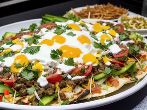 Kleurrijke Mexicaanse ontbijt nacho's belegd met krokant gebakken gehakt, verse groenten en perfect gebakken spiegeleieren. De tortillachips zijn rijkelijk gegarneerd met tomaat, komkommer, peterselie en een romige saus. Een feestelijk gerecht dat perfect is voor een uitgebreide brunch of bijzonder ontbijt.