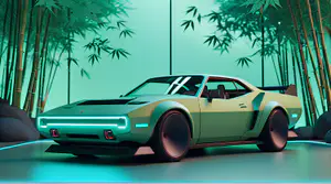 Een gemoderniseerde klassieke sportwagen in mintgroen staat geparkeerd in een serene omgeving omringd door bamboe. De auto combineert retro-design met futuristische elementen zoals de turquoise neonverlichting in de koplampen en de strakke velgen. Het zachte mintgroene kleurenpalet en de rustgevende bamboe creëren samen een harmonieuze zen-sfeer, terwijl de subtiele verlichting het geheel een moderne cyberpunk-achtige uitstraling geeft.
