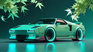 Een vintage sportwagen in mintgroen met opvallende turquoise neonverlichting rond de wielen staat in een minimalistisch decor. De jaren '80 auto is gemoderniseerd met futuristische elementen die een perfecte retrofuturistische uitstraling creëren. Japanse esdoornbladeren hangen van bovenaf in het beeld, wat een subtiele zen-sfeer toevoegt. De glanzende vloer reflecteert het turquoise licht en versterkt de cyberpunk-esthetiek.