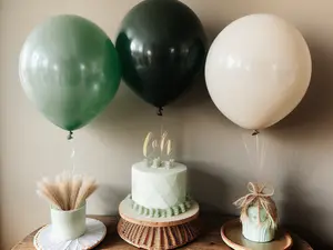 Stijlvolle feestopstelling in zachte natuurtinten met drie grote ballonnen in mintgroen, zwart en wit. Centraal staat een elegante taart op een rieten plateau, omringd door decoratieve elementen zoals droogbloemen en een sfeervol versierde vaas. perfect voor een moderne botanische feestsfeer.