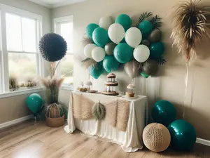 Moderne feestdecoratie met turquoise ballonnen en bohemian details AI-gegenereerd