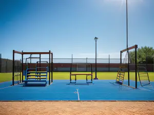 Eigentijdse speelplaats met diverse schommeltoestellen op een veilige blauwe rubberen ondergrond. De speeltuin beschikt over meerdere schommels en klimrekken in een moderne opstelling. perfect voor openbare ruimtes, scholen of recreatiegebieden waar kinderen veilig kunnen spelen en bewegen in de buitenlucht.