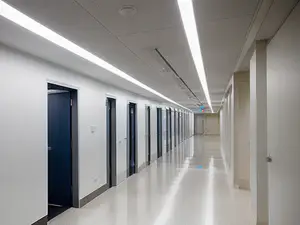 Klinische ziekenhuisgang met strakke LED-lijnverlichting en contrasterende blauwe deuren tegen witte wanden. De glanzende vloer en minimalistische vormgeving creëren een professionele, steriele uitstraling die past bij moderne zorginstellingen. perfect voor medische communicatie of healthcare marketing.