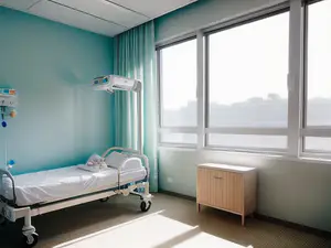 Lichte en rustgevende ziekenhuiskamer met moderne medische voorzieningen. De ruimte wordt gekenmerkt door kalme mintgroene wanden, een comfortabel verstelbaar bed en grote ramen die veel natuurlijk daglicht binnenlaten. De functionele inrichting combineert medische apparatuur met een serene sfeer voor optimaal patiëntencomfort.