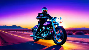 Sfeervolle foto van een motorrijder op een custom motorfiets tegen een dramatische zonsondergang in neonkleuren. De woestijnweg strekt zich uit naar de horizon waar bergsilhouetten zichtbaar zijn. De combinatie van paarse en oranje tinten creëert een retro-futuristische sfeer die perfect past bij het avontuurlijke karakter van motorrijden.