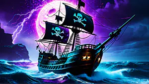 Spectaculaire nachtelijke scène van een imposant piratenschip met zwarte zeilen en doodshoofdvlaggen, varend door een woeste zee. De dramatische paarse volle maan en elektrisch blauwe bliksemschichten creëren een mysterieuze, bijna bovennatuurlijke sfeer. perfect voor gaming artwork, boekomslagen of fantasy-gerelateerde projecten.