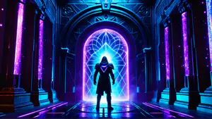 Sfeervolle digitale kunstscène met een mysterieus silhouet in een architectonische omgeving. De poort wordt verlicht door intense neonkleuren in blauw en paars, met een geometrisch patroon dat doet denken aan moderne gaming-esthetiek. perfect voor gaming-gerelateerde projecten of futuristische concepten.
