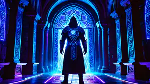 Sfeervolle fantasiescène van een mysterieuze krijgersfiguur in zwart gewaad, staand in een gotische kathedraal. De ruimte wordt gedomineerd door intens blauw neonlicht dat de middeleeuwse architectuur en versieringen accentueert. Het silhouet wordt omringd door magische lichteffecten, wat een betoverende gaming-achtige sfeer creëert.