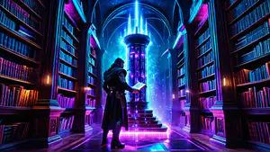 Sfeervolle fantasiebibliotheek met een mysterieuze figuur die een boek bestudeert voor een magische energiezuil. De ruimte wordt verlicht door neon blauw en paars licht, met hoge boekenkasten langs de muren. De architectuur heeft een gotische uitstraling met gewelfde bogen en een dramatische centrale energiebron die een bovennatuurlijke gloed ui...