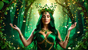 Betoverende fantasy-compositie in weelderig groen met mystieke sfeer. Een elegante verschijning in smaragdgroene jurk met gouden details staat in een magisch verlicht bos. Gouden lichteffecten, dwarrelende bladeren en een kroon van bladgoud creëren een sprookjesachtige atmosfeer. perfect voor boekomslagen, fantasy-projecten of decoratieve doelei...