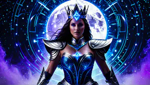 Betoverende fantasy illustratie van een machtige krijger in glanzend blauw harnas, getooid met een koninklijke kroon tegen een achtergrond van een stralende volle maan. Het kunstwerk combineert mystieke elementen met futuristische details, omgeven door kosmische energie en sterrennevels in paarse en blauwe tinten.