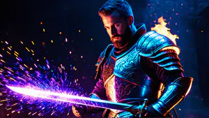 Dramatische fantasy-afbeelding van een ridder in decoratief harnas, verlicht door neon blauw en paars licht. Het magische zwaard vonkt en gloeit in het donker, terwijl vlammen langs het harnas dansen. perfect voor gaming artwork, boekomslagen of fantasy-gerelateerde projecten waar een epische sfeer gewenst is.
