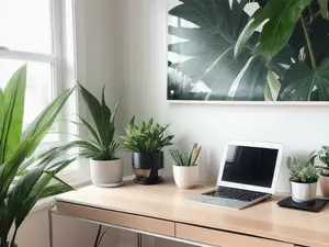 Moderne thuiswerkplek met een harmonieuze mix van technologie en natuur. Het lichte houten bureau wordt verlevendigd door diverse groene kamerplanten en een stijlvolle botanische wandprint. De minimalistische opstelling met laptop straalt rust en productiviteit uit, perfect voor het nieuwe werken.