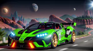 Deze opvallende neon groene raceauto met gouden velgen en futuristische LED-verlichting raast over een racebaan in een surrealistisch fantasy landschap. De agressieve aerodynamische vormgeving met carbon accenten en race-modificaties benadrukt het competitieve karakter. Op de achtergrond creëren meerdere planeten aan de hemel en indrukwekkende rotsformaties een science-fiction sfeer in deze digitale kunstcreatie.