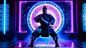 Krachtige compositie van een samurai krijger in traditionele kleding, gepositioneerd voor een verlichte magische cirkel met neon effecten. De sfeervolle combinatie van paarse en blauwe verlichting creëert een cyberpunk atmosfeer. perfect voor gaming artwork, fantasy projecten of moderne Aziatische concepten.