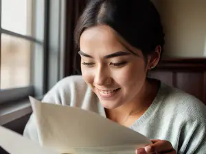 Sfeervolle momentopname van een rustig leesmoment bij het raam. Het natuurlijke daglicht zorgt voor een warme, uitnodigende sfeer tijdens het lezen van een document of boek. De zachte trui en ontspannen houding stralen rust en comfort uit, perfect voor lifestyle en interieur fotografie.