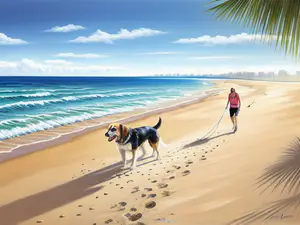 Schilderachtige illustratie van een zonnige strandwandeling langs een tropische kust. Een hond en zijn begeleider laten voetsporen achter in het goudgele zand, terwijl turquoise golven rustig aanrollen. Op de achtergrond zijn palmbomen en een stedelijke skyline te zien onder een strakblauwe hemel met witte wolken.