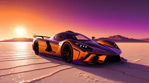 Een state-of-the-art racebolide met een spectaculaire kleurovergang van oranje naar paars staat gepositioneerd op de eindeloze kristallijne zoutvlakte van wat lijkt op Bonneville of Salar de Uyuni. De opkomende zon baadt het landschap in een betoverend licht, waardoor de hemel transformeert van goud naar magenta en uiteindelijk in een diep paars. De strakke lijnen en agressieve contouren van de auto worden versterkt door het zachte licht, terwijl de gebarsten zoutpatronen onder de zwarte velgen